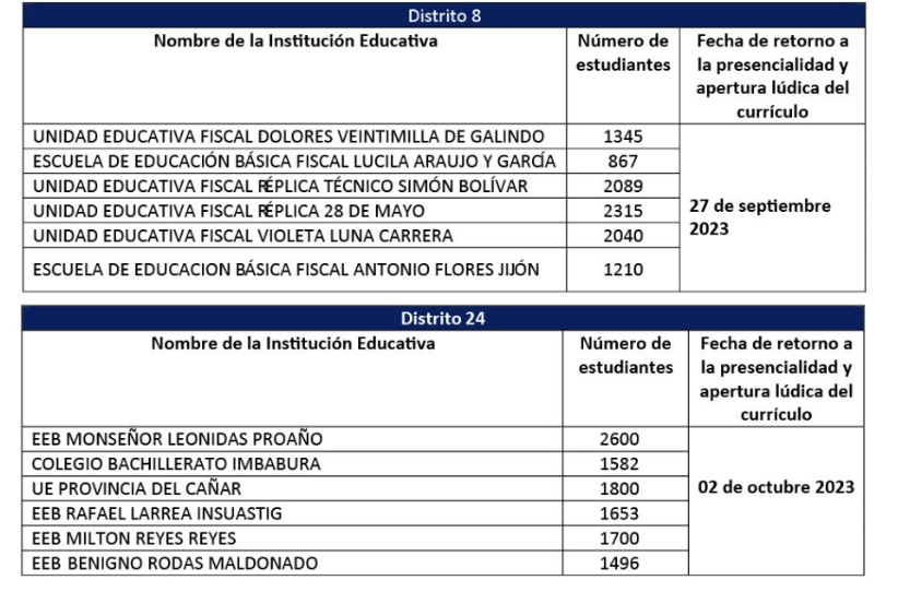 Debido a los “hechos violentos” suscitados en las inmediaciones de las instituciones educativas, el Ministerio de Educación informó que se aplicará el Plan de Continuidad Educativa, a distancia, en establecimientos educativos específicos de los Distritos 8 y 24 de Guayaquil (Monte Sinaí) y Durán.