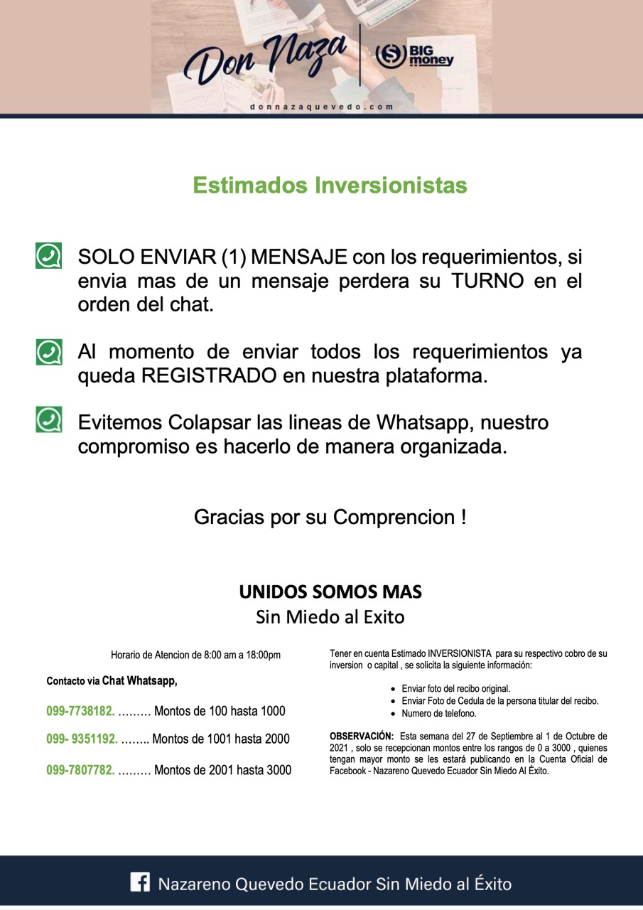 La página oficial de Facebook “Nazareno Quevedo Ecuador sin miedo al exito” fue el canal oficial que Don Naza habilitó para establecer contacto con sus usuarios y devolverles el dinero. Hasta diciembre de 2021, en la red social se publicaron varios videos de testimonios que aseguraban se les había devuelto el dinero invertido en la plataforma Big Money.