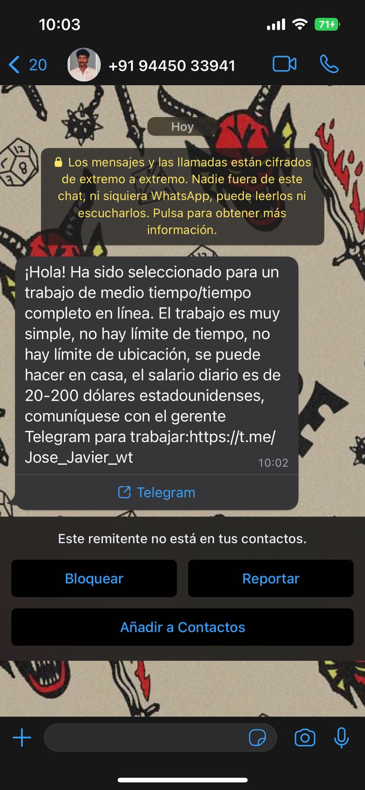Si bien, este tipo de estafa circula en WhatsApp circula desde mayo de 2022, esta semana varios usuarios volvieron a recibir los mensajes en los que se ofrece ganar entre 20 y 200 dólares al día y a continuación se adjunta un link, supuestamente, de Telegram.