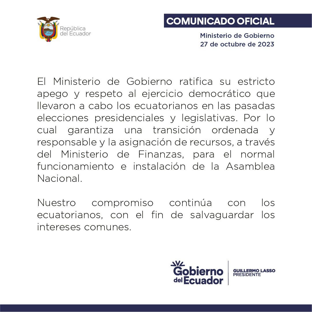 En un comunicado, esa carteara de Estado señala: “Garantizamos una transición ordenada y responsable y la asignación de recursos a través del Ministerio de Finanzas para el normal funcionamiento e instalación de la Asamblea Nacional”.