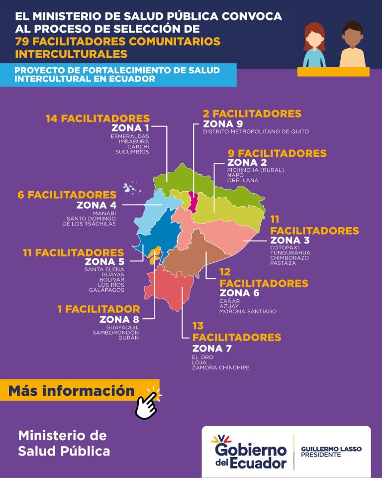 Así también, se seleccionarán a 79 facilitadores comunitarios interculturales para esta misma iniciativa. Para este cargo se busca a personas con la siguiente instrucción: Bachillerato, Tecnología, Egresados(as) del tercer nivel.