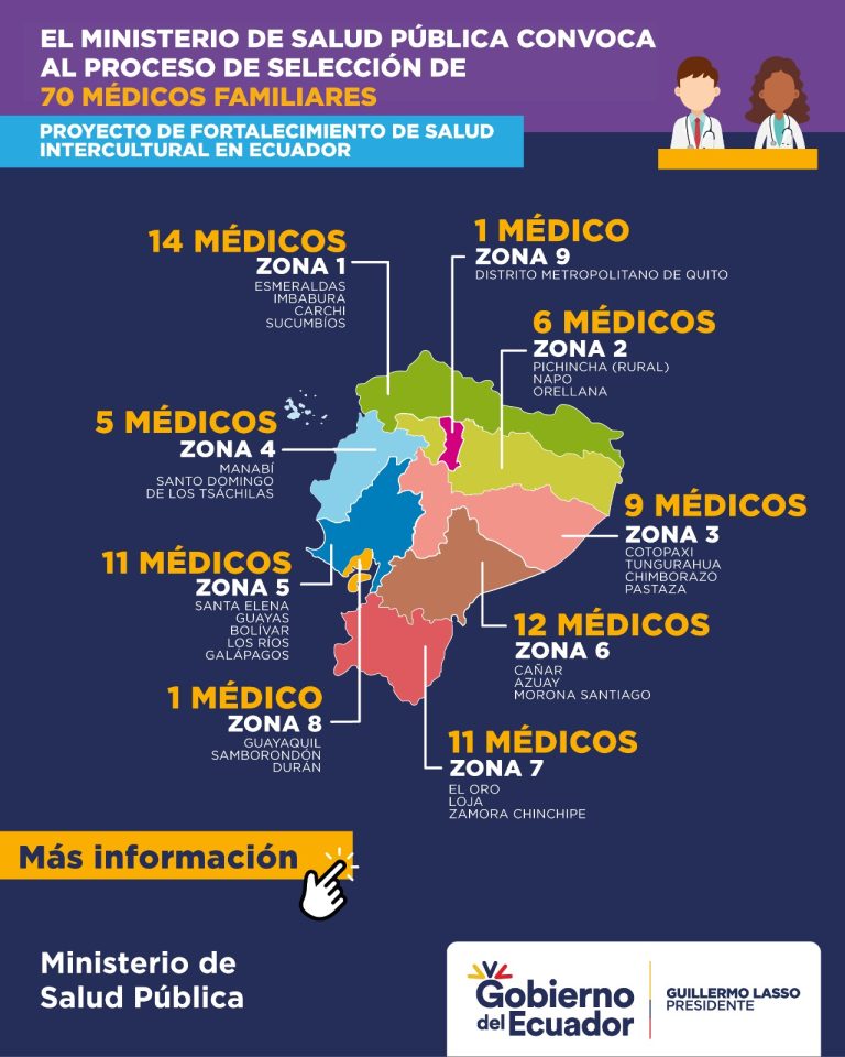 A través de sus cuentas oficiales el Ministerio de Salud informó que esta cartera de Estado abrió la convocatoria para la contratación de 70 médicos familiares para el proyecto de fortalecimiento de salud intercultural en Ecuador.