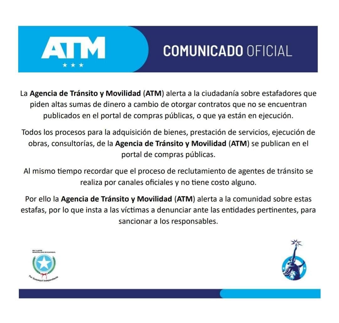La entidad indicó que “todos los procesos para la adquisición de bienes, prestación de servicios, ejecución de obras, consultorías, de la Agencia de Tránsito y Movilidad (ATM) se publican en el portal de compras públicas”.