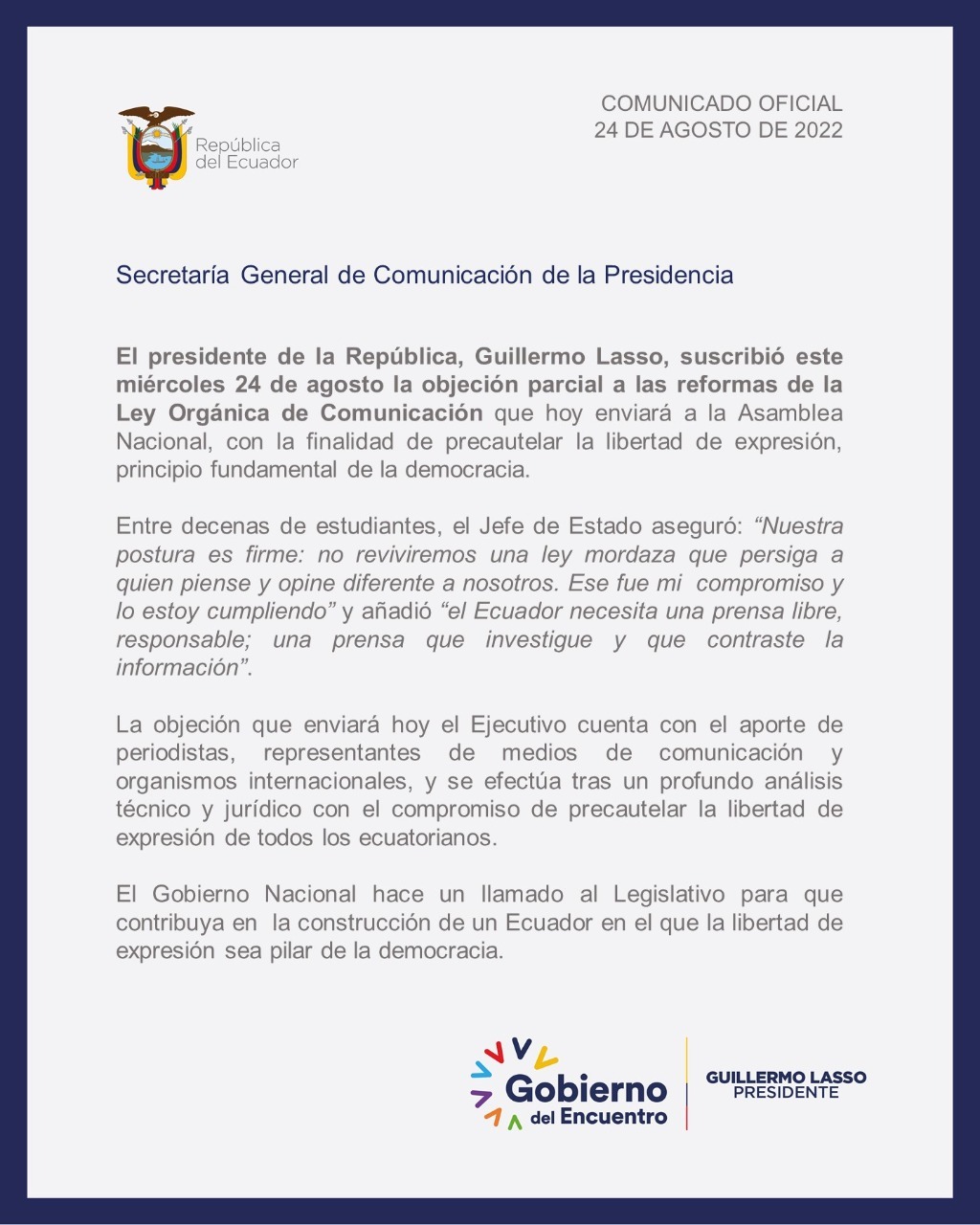 A través de la Secretaria General de Comunicación de la Presidencia se informó que el presidente de la República, Guillermo Lasso, suscribió este miércoles 24 de agosto la objeción parcial a las reformas de la Ley Orgánica de Comunicación que hoy enviará a la Asamblea Nacional.