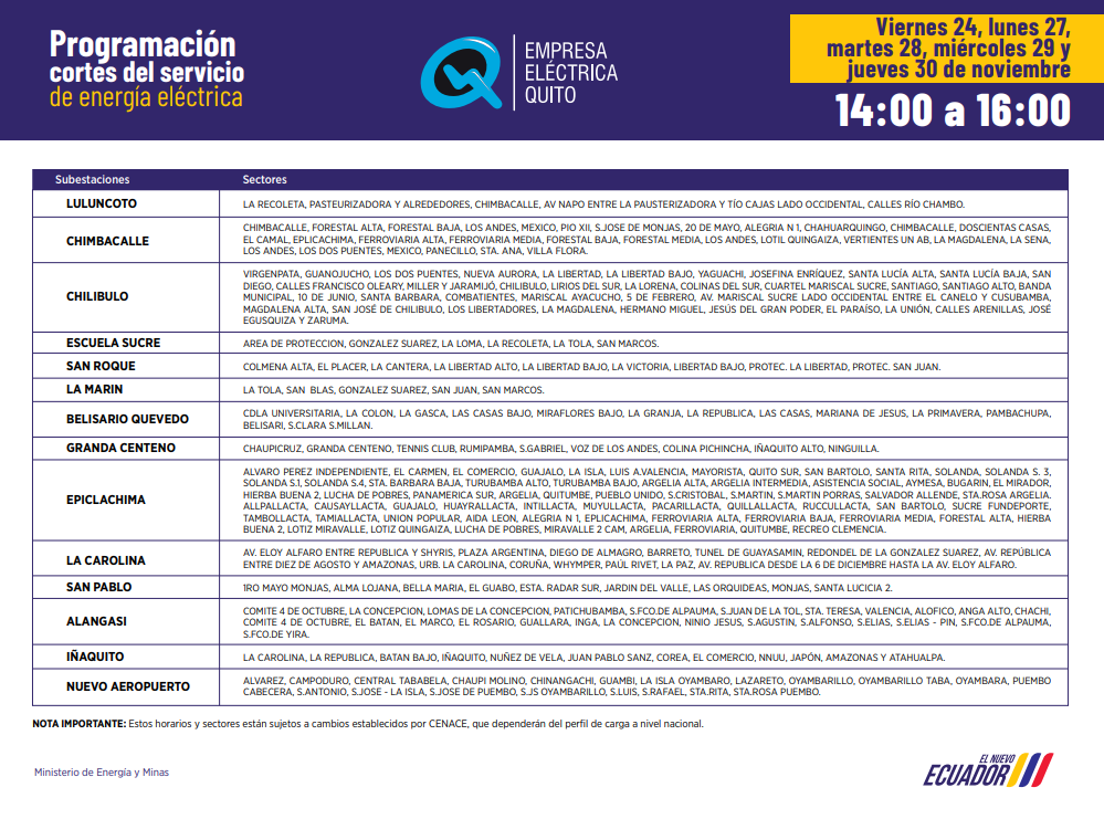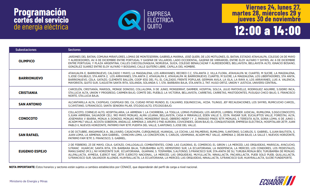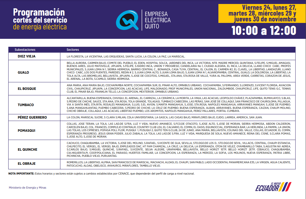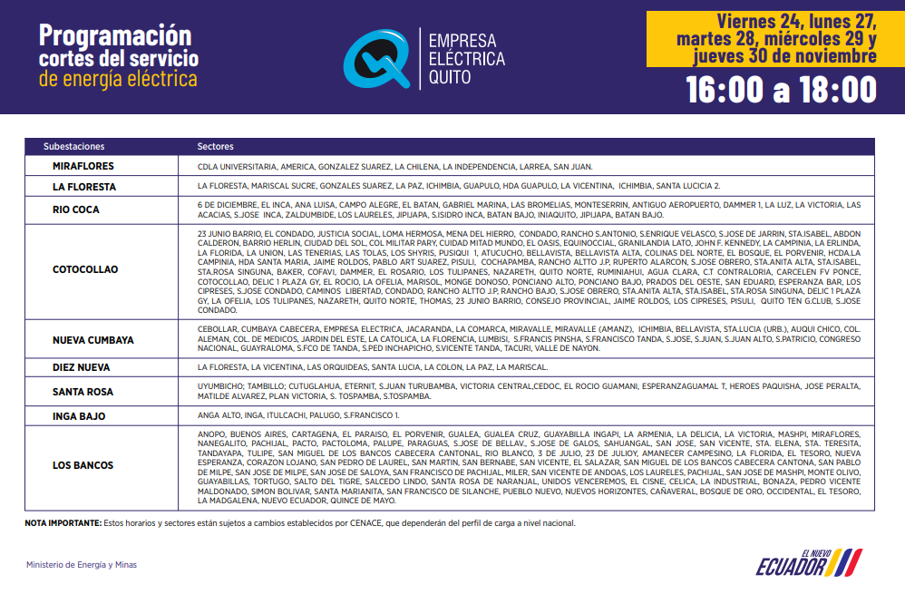 La Empresa Eléctrica Quito publicó los horarios que regirán para este jueves 30 de noviembre del 2023. La institución confirmó, la noche de este 29 de noviembre, que no habrá desconexiones de energía los días viernes 1, sábado 2, domingo 3 y lunes 4 de diciembre de 2023. La suspensión de energía, en Quito, se retomará desde el martes 5 de diciembre.
