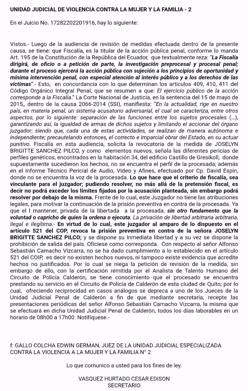 Con esto, la joven quedaría libre en el transcurso del día. Ella fue detenida desde el 16 de septiembre de 2022, como parte de la investigación. Es decir, permaneció casi cuatro meses en la Casa de Confianza Chillogallo, en el sur.