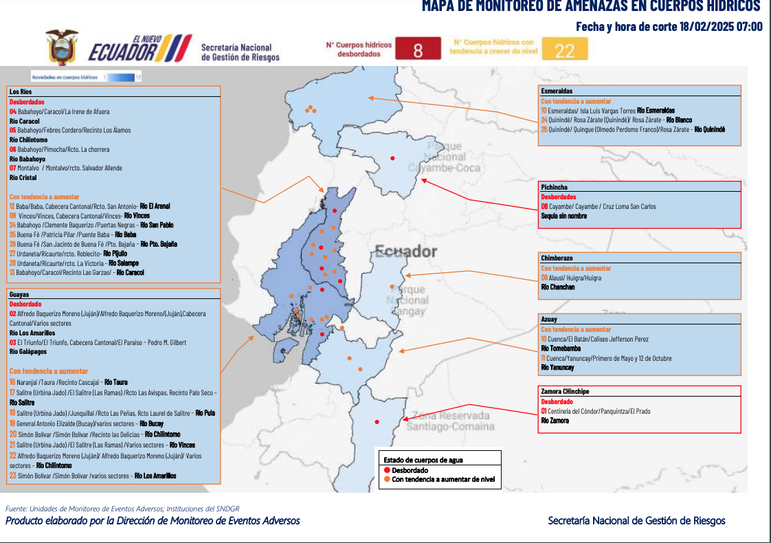 Ocho ríos se desbordaron en Los Ríos y Guayas y hay otros 22 ríos en riesgo por posibles desbordamientos. Estos están ubicados en Chimborazo, Esmeraldas, Guayas, Los Ríos y Azuay, según datos de la SNGR con corte a las 07:00 de este martes, 18 de febrero de 2025.
