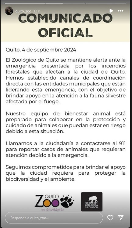 El Zoo Quito emitió el miércoles, 4 de septiembre de 2024, un comunicado en el cual se detalla que se mantiene en alerta ante la emergencia presentada por los incendios forestales en la ciudad.