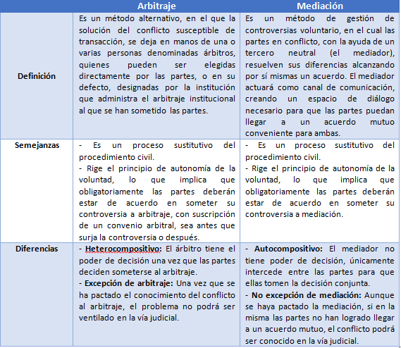 Las características antes señaladas sirven únicamente para aproximar al lector al conocimiento de estos métodos alternativos de solución de conflictos. Sin embargo, cada emprendedor deberá asesorarse con su abogado al momento de suscribir contratos en los que se pacte una cláusula de solución de controversias, ya sea para supeditarse a arbitraje o para acudir a mediación.