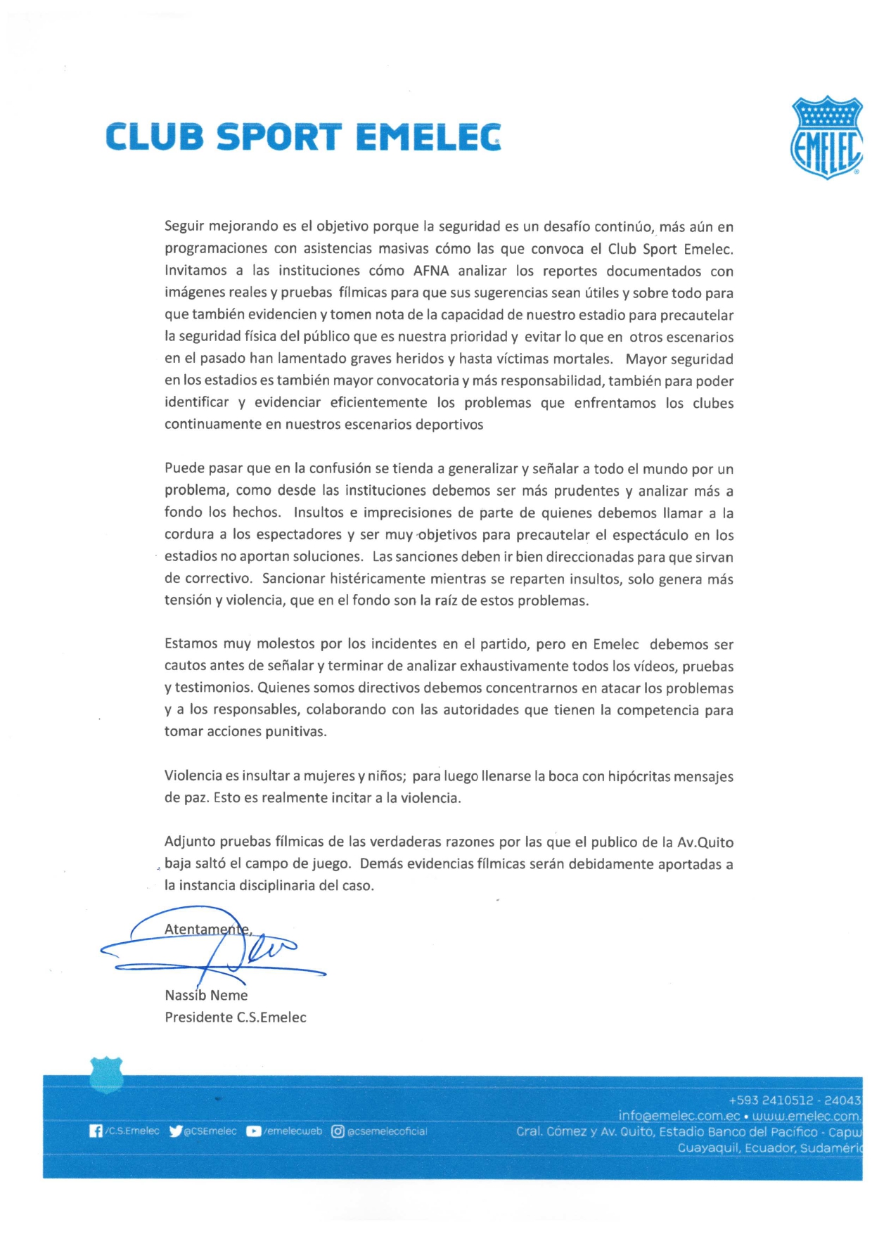 Emelec finalizó su comunicado manifestando su molestia por lo suscitado, y llamaron a analizar exhaustivamente todos los videos, los que serán aportados a la instancia disciplinaria correspondiente.