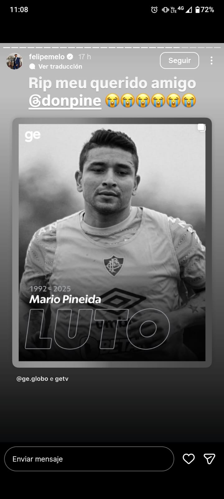 Las muestras de afecto se multiplicaron entre quienes compartieron vestuario con Pineida. Felipe Melo, capitán de aquel Fluminense campeón y amigo cercano del ecuatoriano, escribió un emotivo mensaje de despedida: “Descansa, querido amigo”.