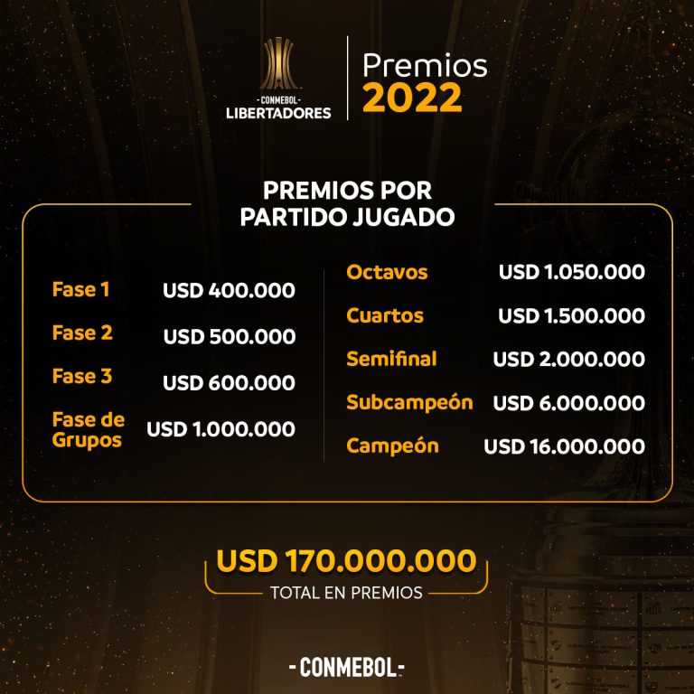 La Confederación Sudamericana de Fútbol (Conmebol) decidió aumentar los premios para sus competiciones en este 2022. El monto global subió a USD 17 millones. En el 2021 se repartieron 229 millones a lo largo de los torneos. Y para este 2022 se incrementó a USD 246 millones.