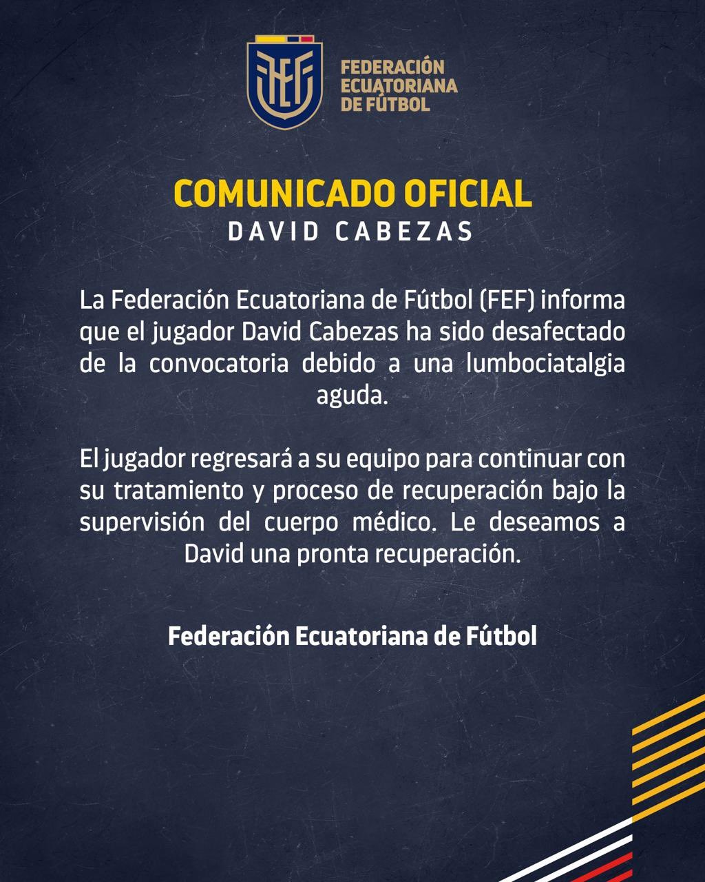 La información oficial de la Tri detalla que Cabezas regresará a su equipo para continuar con su tratamiento y su proceso de recuperación bajo la supervisión del cuerpo médico. El jugador se suma a las dos bajas ya anunciadas: Gonzalo Plata y Enner Valencia.