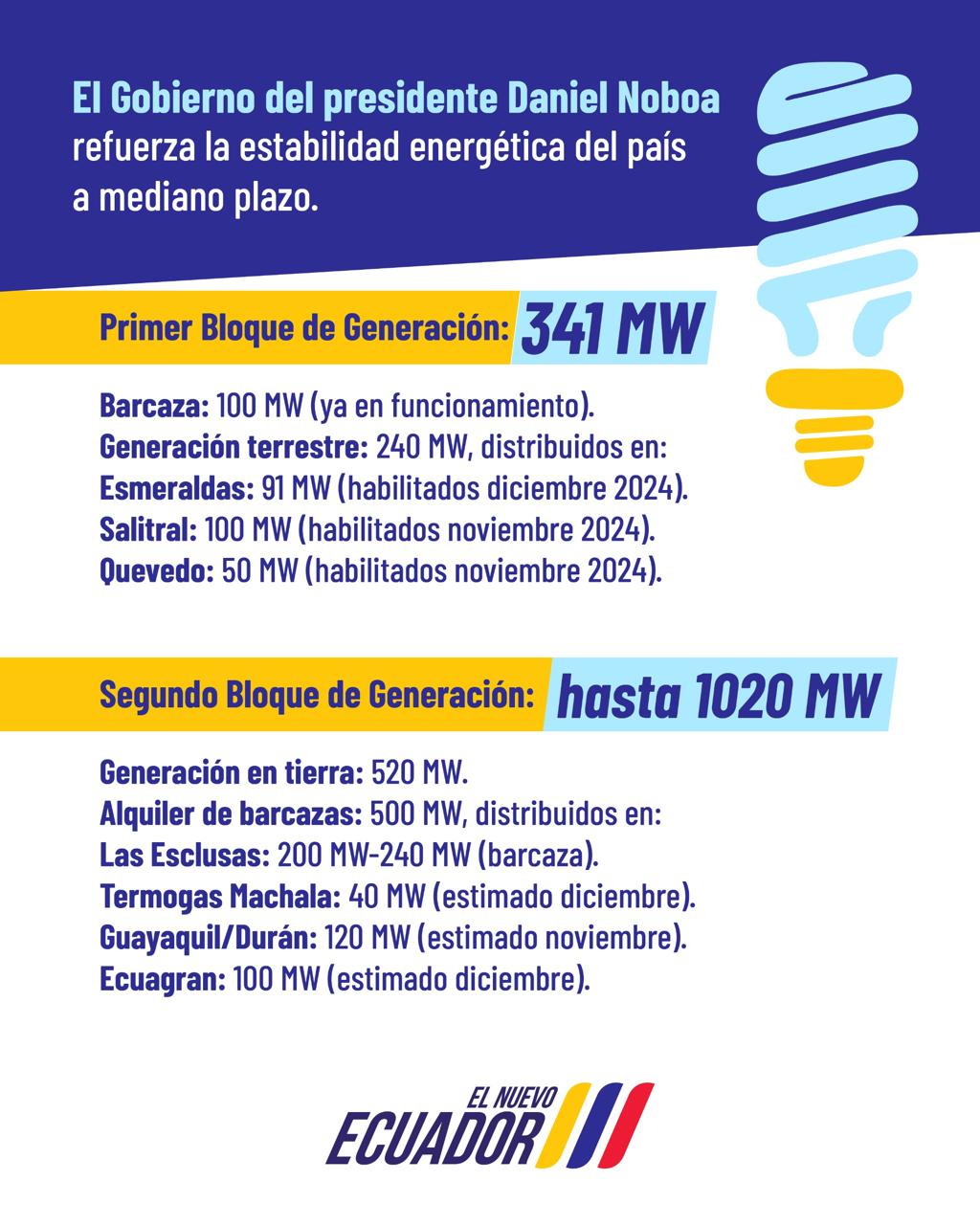 Durante la gestión del presidente Daniel Noboa se establecerá un segundo bloque adicional, que se complementará con 1020 MW: 520 generados en tierra y 500 a través de otros métodos como barcazas.
