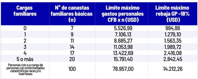 Para el período fiscal 2024, el monto máximo de la rebaja de gastos personales varía en función del número de cargas familiares. El valor se fijó con base en el precio de la canasta básica familiar que fue de USD 789,57 en enero de ese año.