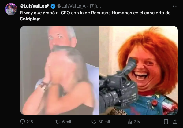 La infidelidad de un reconocido CEO con su “amiga” durante un concierto de Coldplay en Estados Unidos ha desatado una ola de indignación en redes sociales. Los internautas no solo lograron identificar a los protagonistas del incómodo momento, sino que también desataron su creatividad con una avalancha de memes virales que resumen, con humor e ironía, el escándalo. A continuación, te mostramos algunos de los mejores memes: