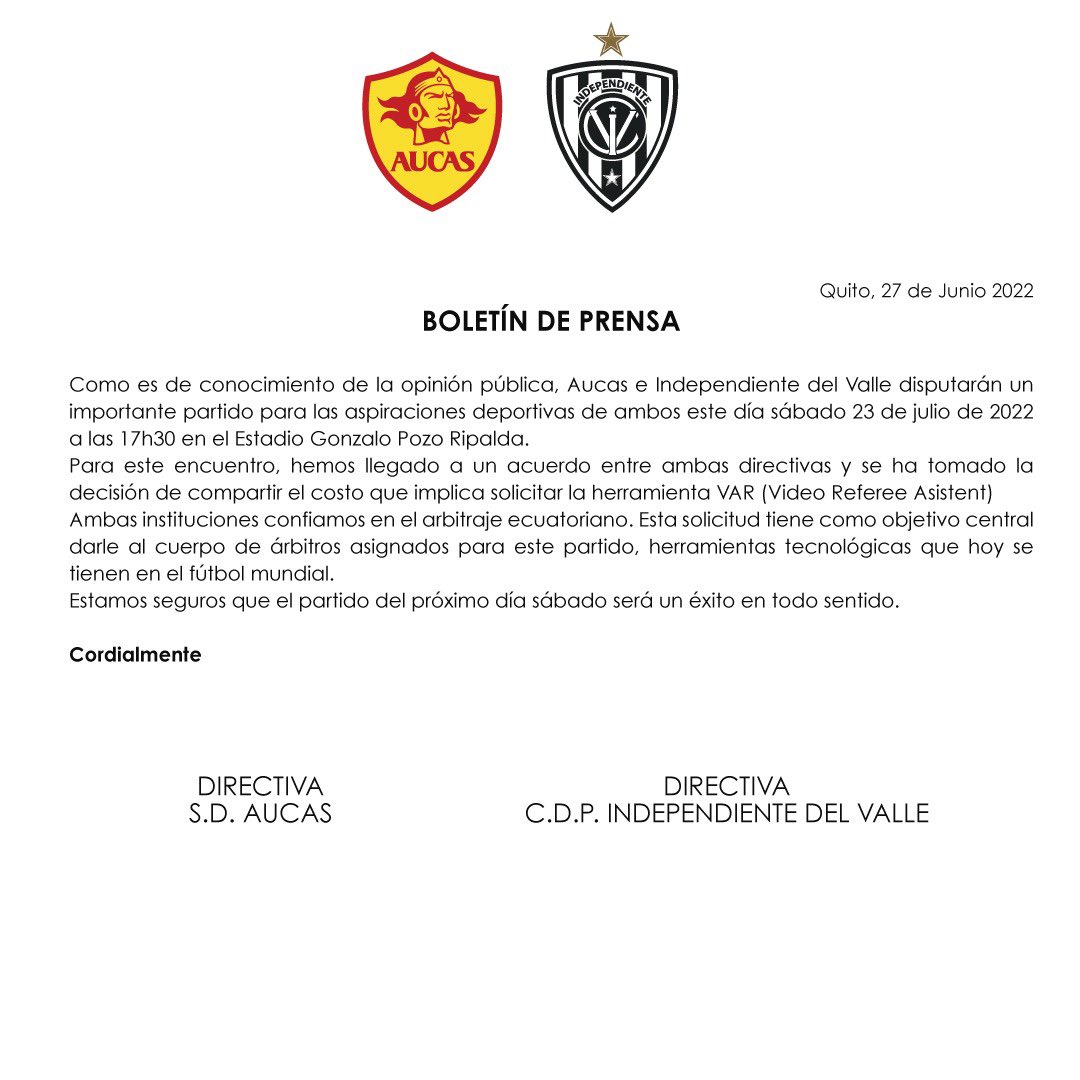 Independiente del Valle y S.D Aucas disputarán su cotejo correspondiente por la tercera fecha de la LigaPro con el apoyo del VAR. Así lo dieron a conocer sus directivas mediante un comunicado este viernes 22 de julio del 2022.