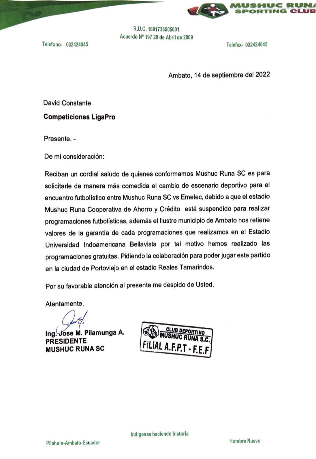 Mushuc Runa y Emelec deben enfrentarse por la duodécima fecha de la segunda etapa de Liga Pro, el cuadro ambateño será local para este encuentro. Mediante un comunicado enviado a la Dirección de Competiciones, el presidente del club, José Pilamunga, pidió que el partido se lo juegue en el Estadio Reales Tamarindos en Portoviejo.