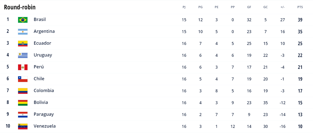 Ecuador suma 25 puntos en la tabla de posiciones, seguido por Uruguay (22), Perú (21) y Chile (19). La Tricolor necesita al menos un empate con Paraguay, en la próxima fecha, para consolidar la clasificación. Esto porque con 26 unidades, matemáticamente no tendrán posibilidades.