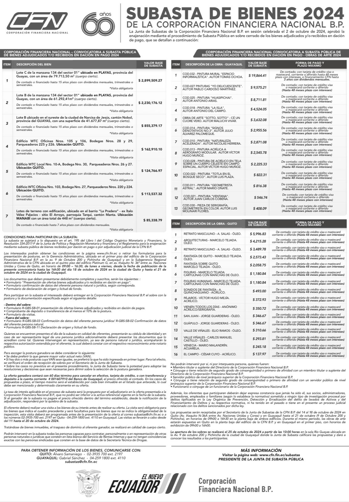Con propiedades a precios competitivos, plazos convenientes y diversas modalidades de pago, la Corporación Financiera Nacional (CFN) realizará la “Subasta de Oportunidades” desde el próximo martes 8 de octubre. En esta segunda temporada de 2024 se ofrece una variada selección de activos inmuebles en las provincias de Guayas, Manabí y Pichincha, así como obras de artes de reconocidos autores.