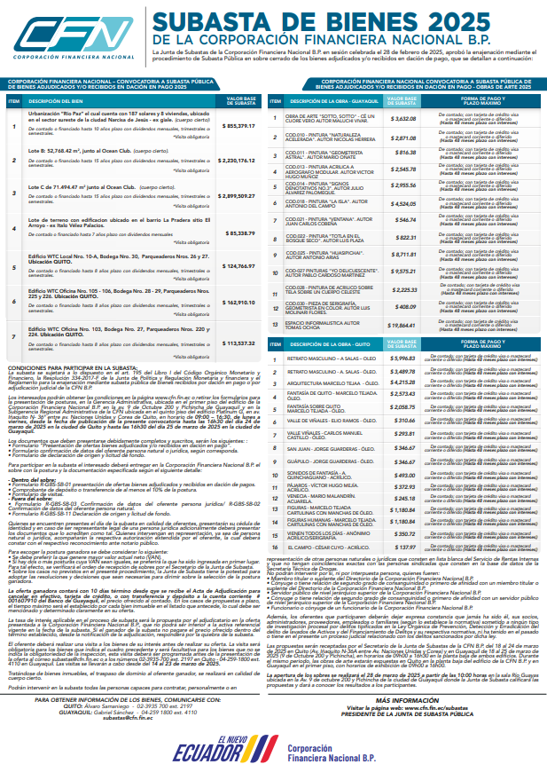 La Corporación Financiera Nacional CFN BP invita a la ciudadanía a participar en la primera subasta pública de bienes recibidos en dación de pago o adjudicación judicial, que se llevará a cabo el 28 de marzo de 2025.