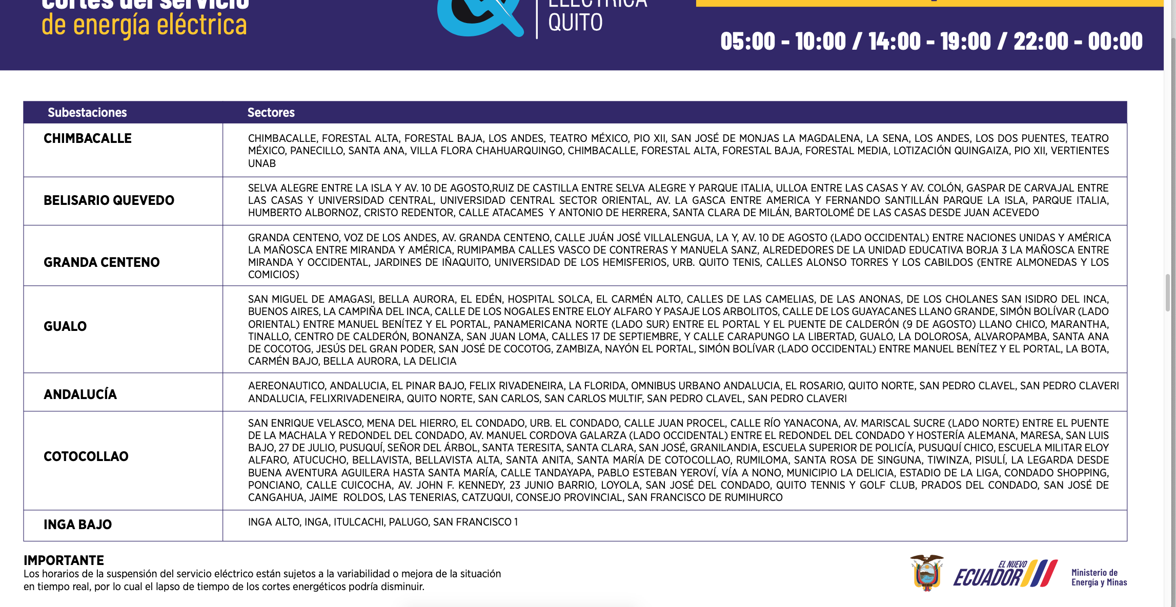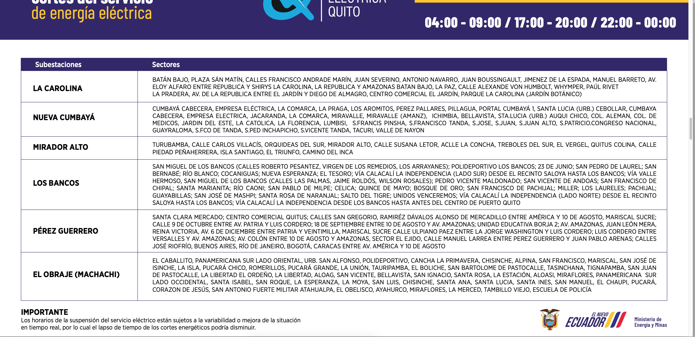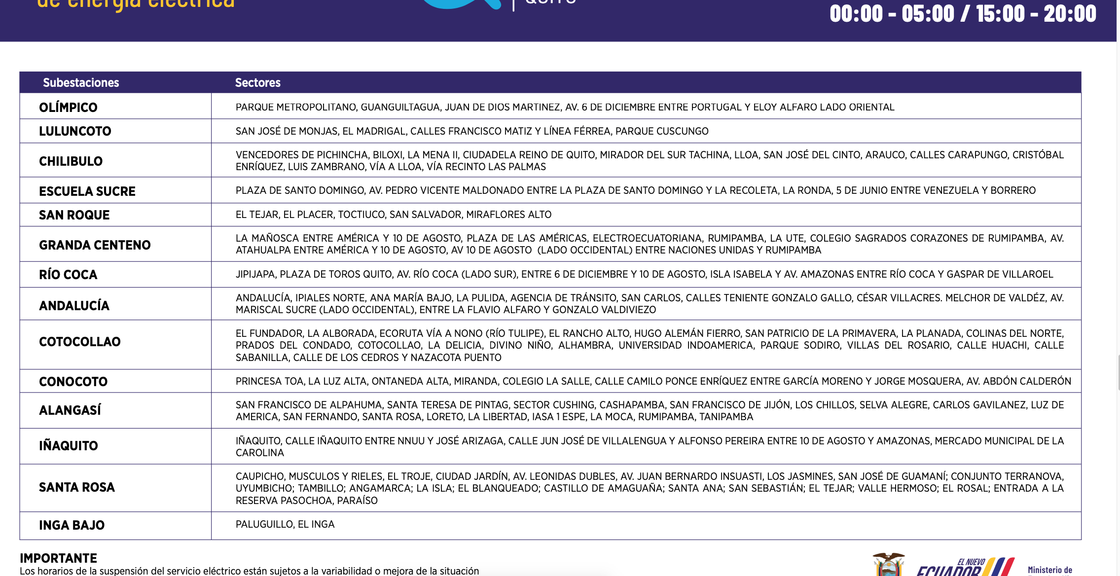 Los horarios de suspensión del servicio de energía están establecidos con base al siguiente calendario: