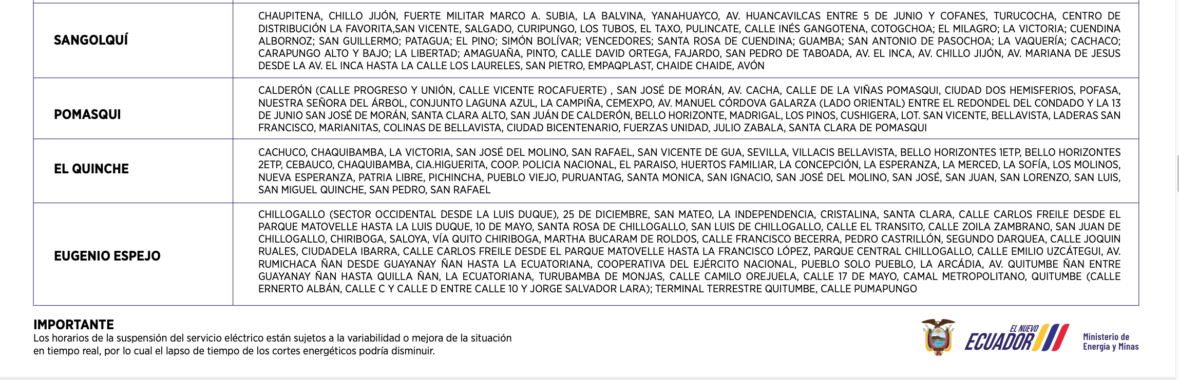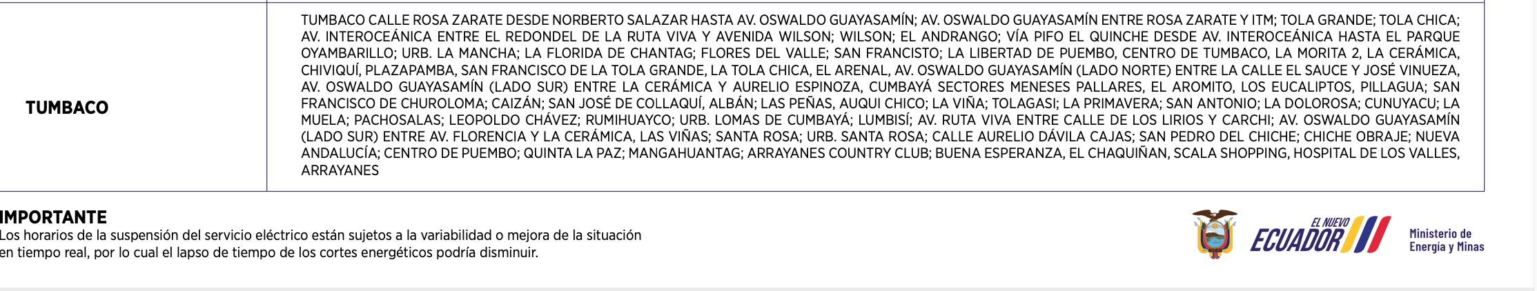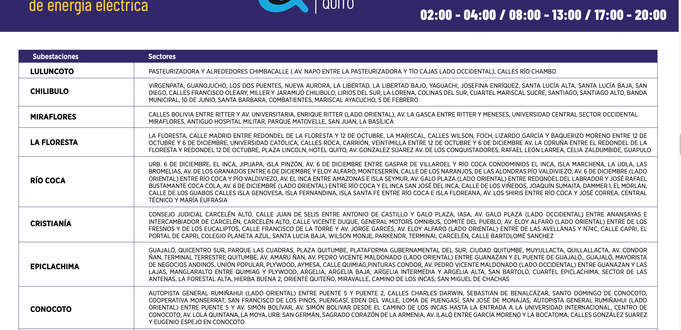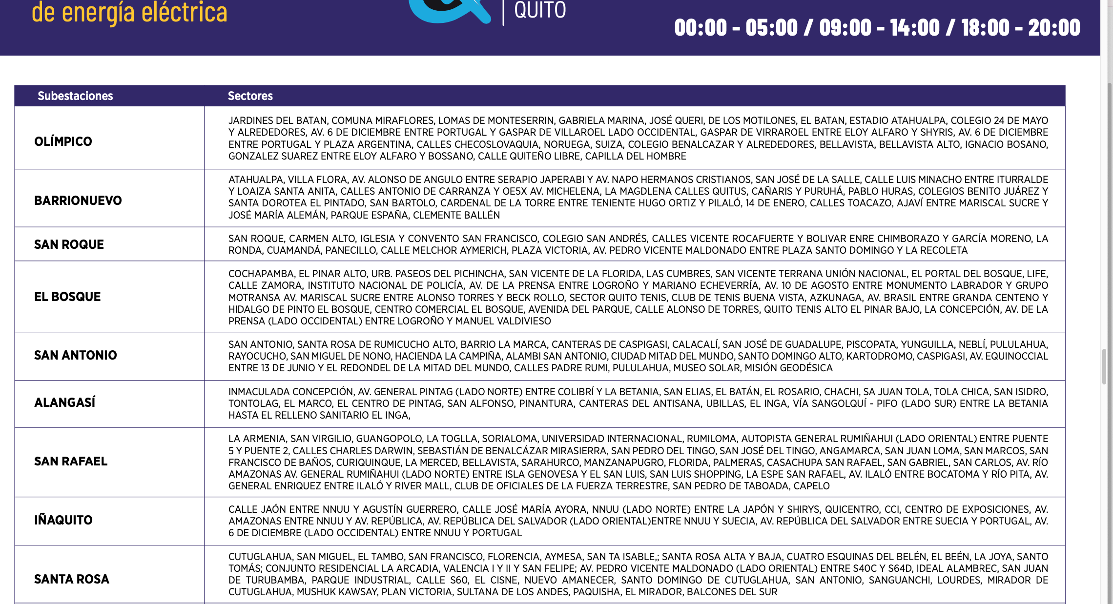 Los horarios de suspensión del servicio de energía están establecidos con base al siguiente calendario: