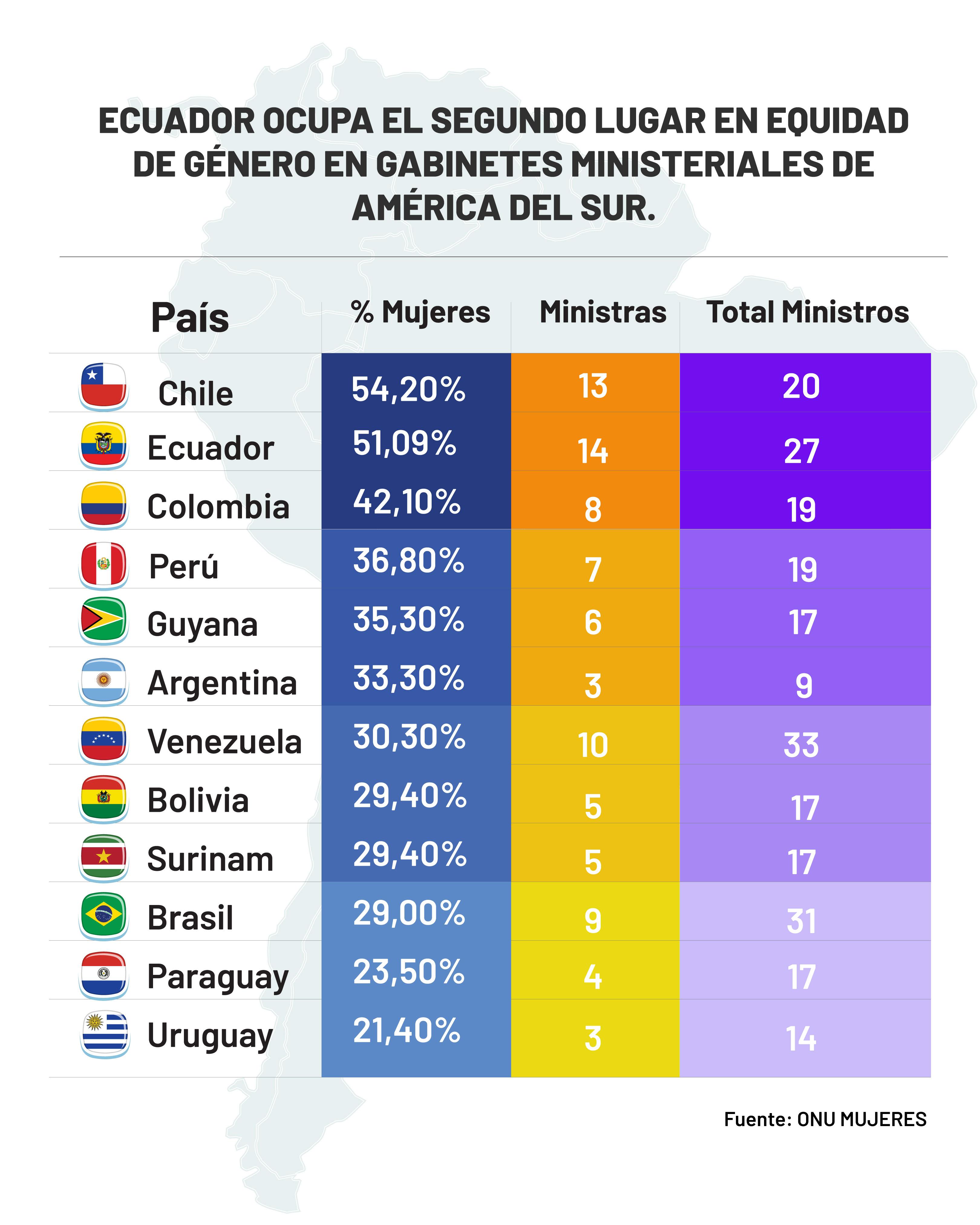 Ecuador se posicionó en 2024 como el segundo país de América del Sur con mayor equidad de género dentro del gabinete del presidente Daniel Noboa.