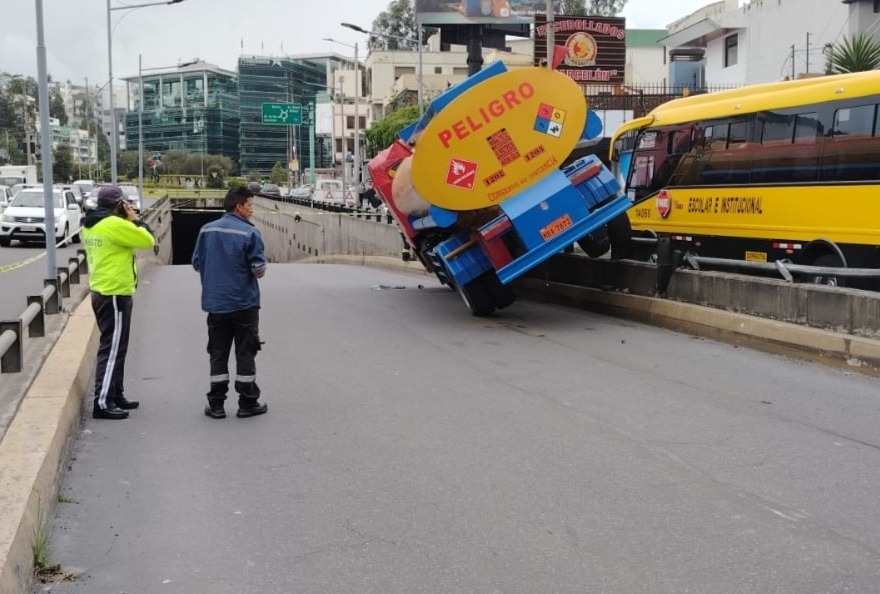 Tanquero pierde pista y queda atorado en la av. Granados y Simón Bolívar