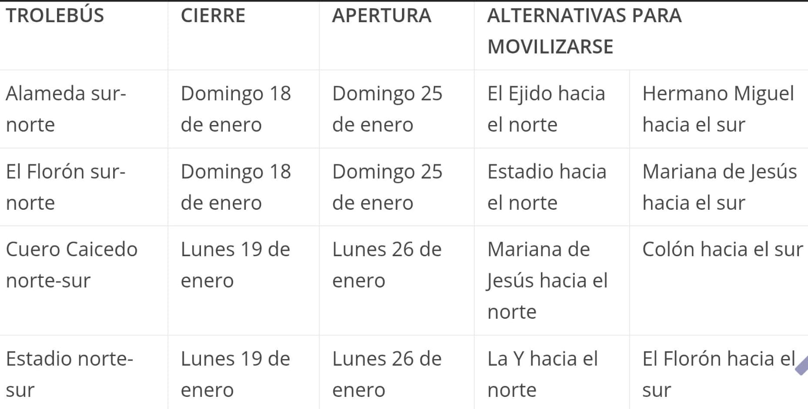 En Quito, varias paradas del sistema municipal de transporte Trolebús y Ecovía se encuentran cerradas de manera temporal debido a trabajos de modernización relacionados con la implementación del Sistema Integrado de Recaudo (SIR).