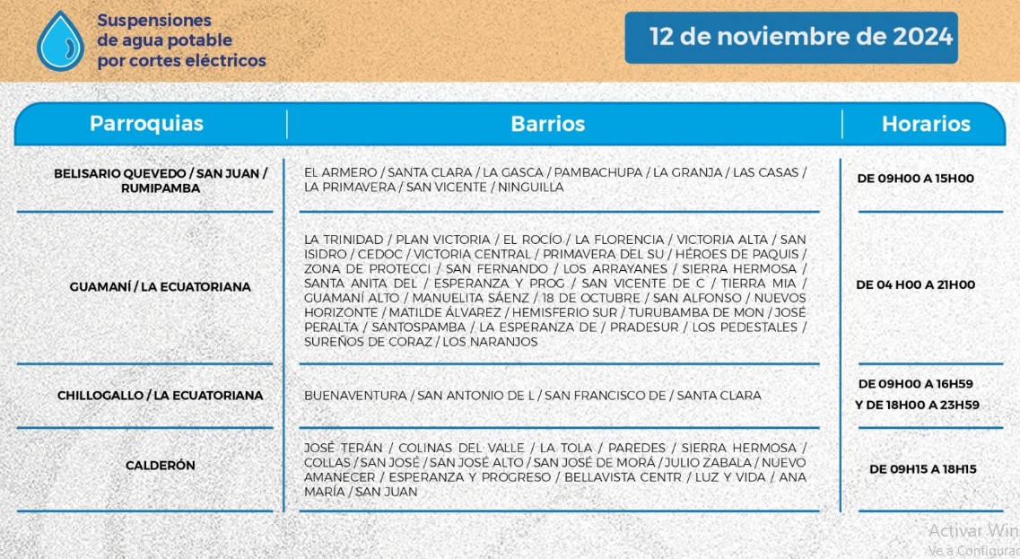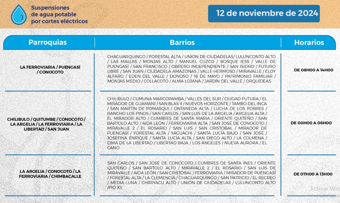 ? #AguaDeQuito | Debido a los cortes de luz anunciados por el Gobierno Nacional, las zonas altas se verán afectadas con el suministro de agua potable. Conoce los horarios y los barrios afectados ? https://t.co/4h0ELptlEI@MunicipioQuito @ambientequito pic.twitter.com/Z34okrb72a