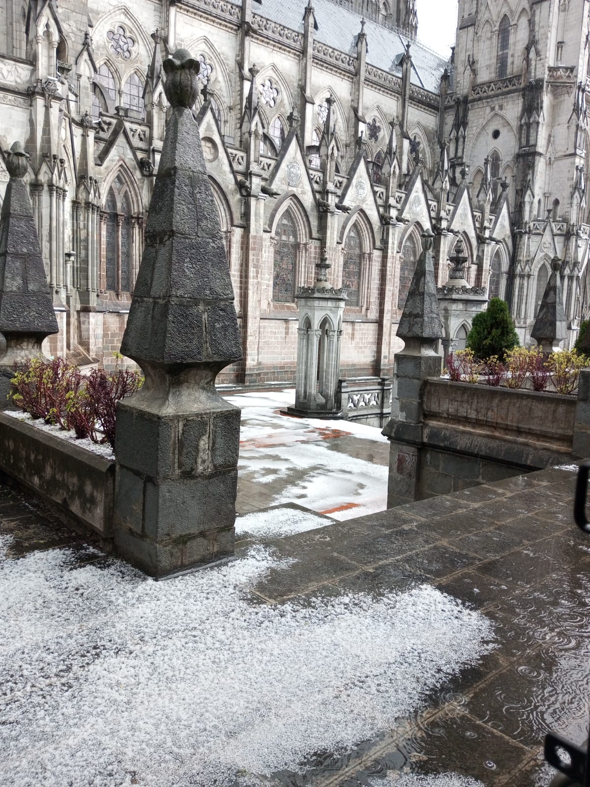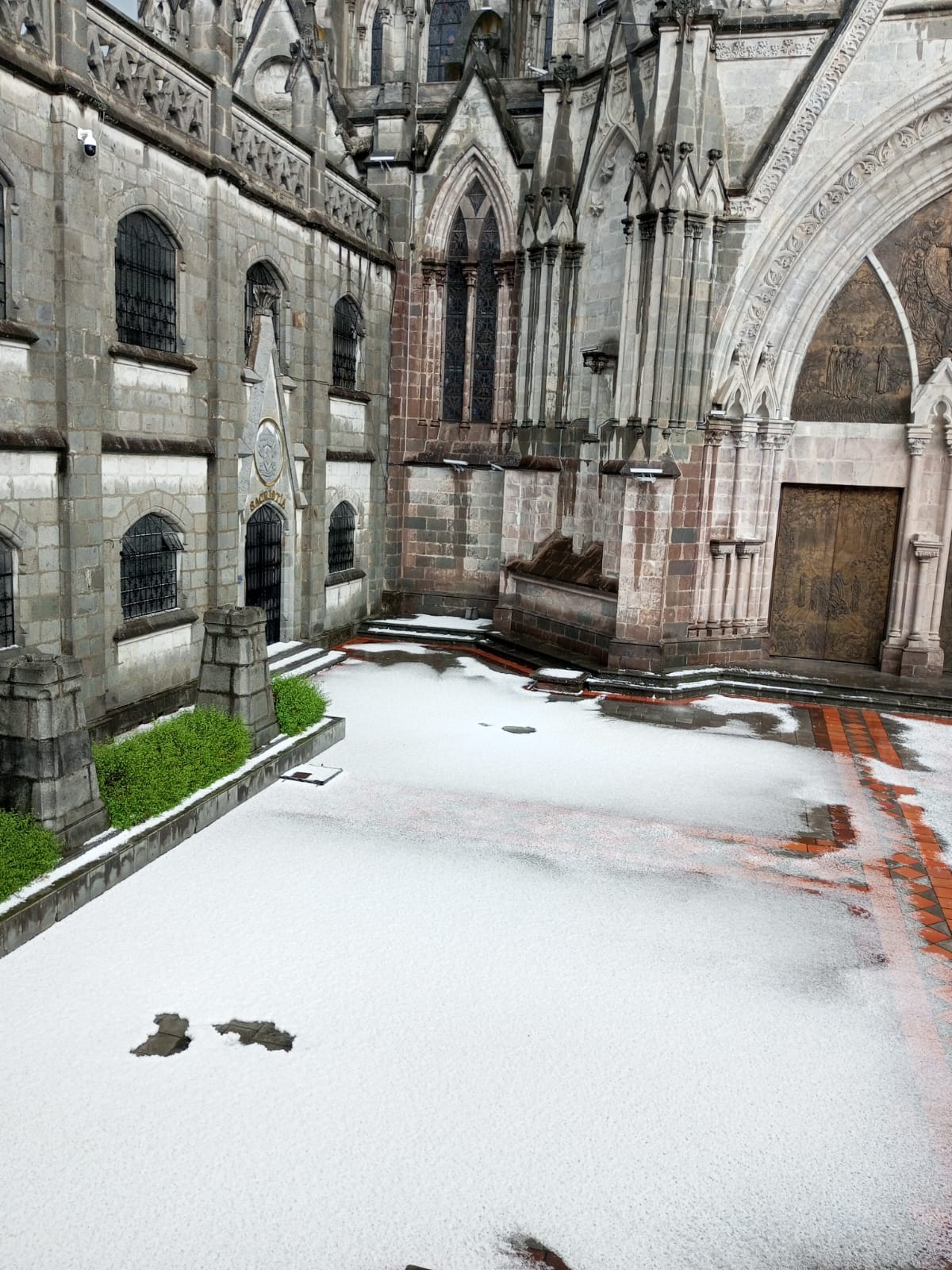 En algunas imágenes compartidas en redes sociales se observa a la Iglesia de la Basílica teñida de blanco, al igual que la avenida América y el Playón de la Marín. En otros puntos se registraron calles inundadas, por esta razón no se activaron los contraflujos en la Avenida Mariscal Sucre y la Autopista Rumiñahui.