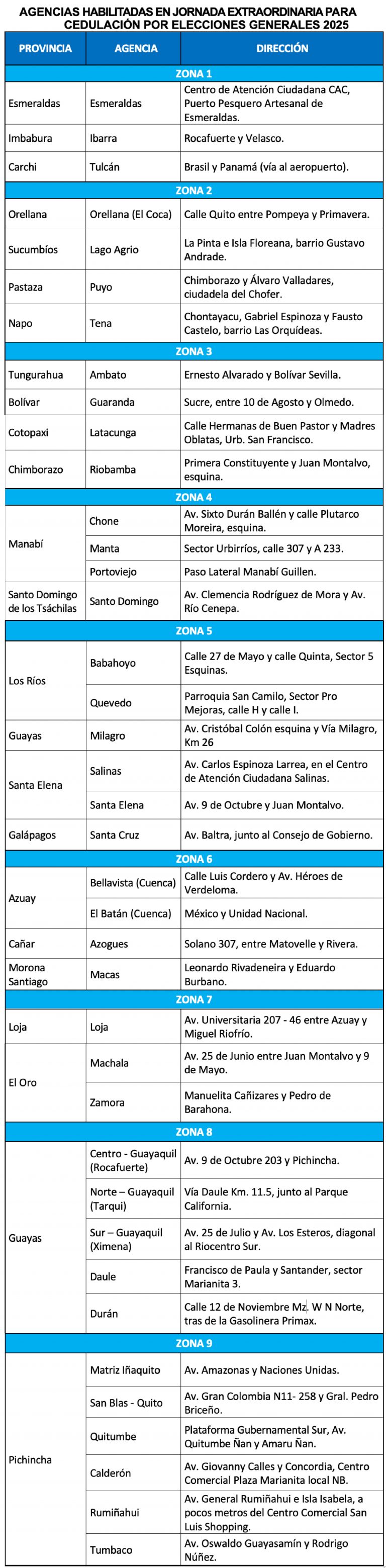 39 agencias a escala nacional del Registro Civil del Ecuador implementarán jornadas extraordinarias de atención al público, en el marco de las Elecciones Generales 2025, que se realizarán el 9 de febrero de 2025.