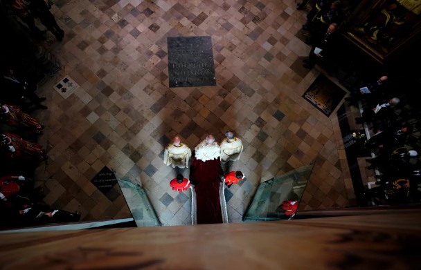 Antes, el monarca fue ungido con aceite consagrado por el arzobispo de Canterbury, el rito religioso más solemne de la liturgia de la coronación, que requiere que el monarca esté temporalmente oculto al público.