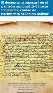 En Colombia apareció el acta de defunción de Simón Bolívar
