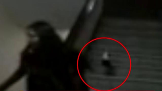 Las impactantes imágenes fueron captadas durante una filmación para una tarea. En ellas se ve a una de las estudiantes subir las gradas, cuando una pequeña figura aparece saltando. La chica ve al duende y corriendo por el susto.