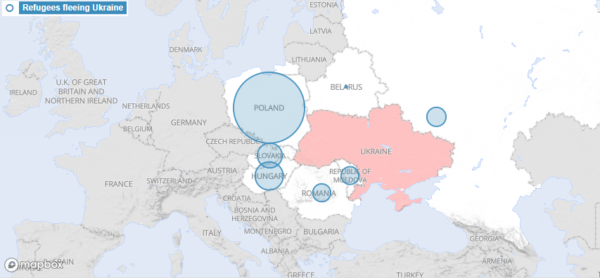 La guerra en Ucrania desencadenó en una masiva huida de la población civil a países vecinos para protegerse de la invasión rusa. Desde el 24 de febrero, más de 2.3 millones de personas han salido del país. Según la última información del Alto Comisionado de Naciones Unidas para los Refugiados (ACNUR), se pueden observar los destinos en una página web destinada para informar estar crisis humanitaria.