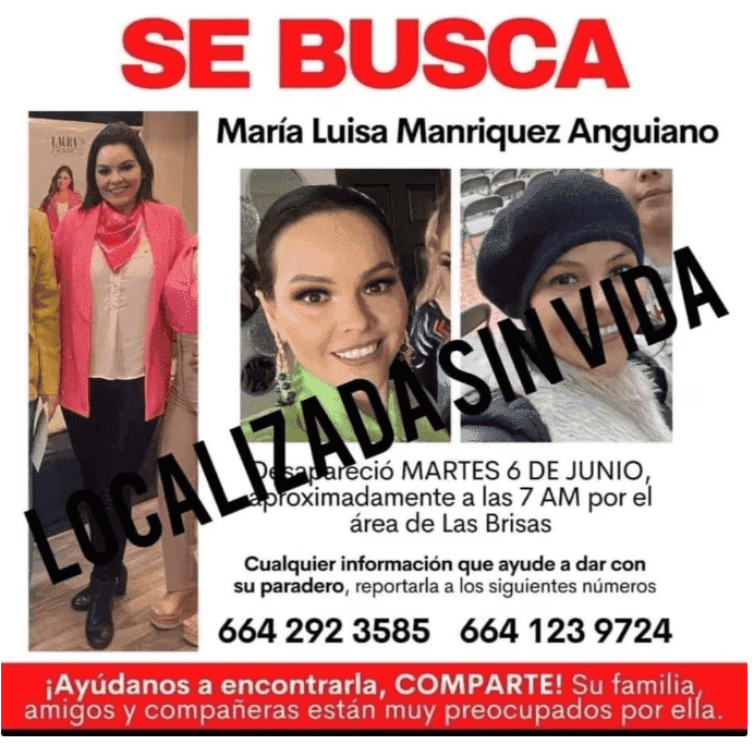 Este martes, 6 de junio de 2023, en México, precisamente en Baja California, medios informaron sobre la desaparición de María Luisa Manríquez Anguiano, modelo y exreina de belleza de que fue vista por última vez, alrededor de las 7 de la mañana, en la colonia Las Brisas de Tijuana.