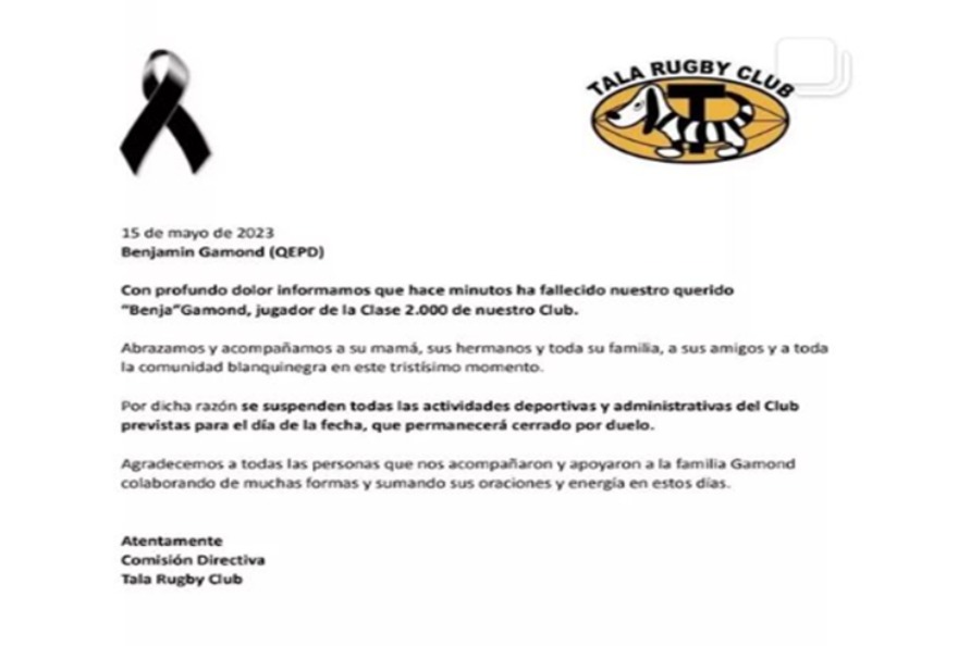 El medio AztecaTV confirmó la muerte de Benjamín Gamond. El deceso fue confirmado por el Club Tala Rugby Club, quien emitió un mensaje sobre el fallecimiento del joven de 23 años.