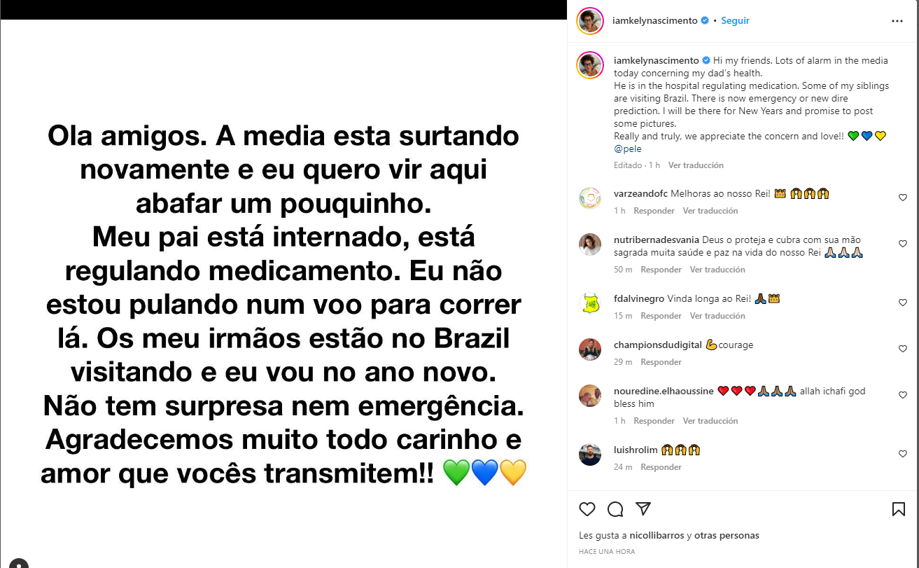 Mientras que la hija de Pelé, Kely Nascimento, publicó un post en Instagram en el que calma a los fans de su padre: "Hola amigos. Mucha alarma en los medios hoy con respecto a la salud de mi padre. Está en el hospital regulando la medicación. Algunos de mis hermanos están visitándole en Brasil. Ahora hay una emergencia o una nueva predicción terrible. Estaré allí para Año Nuevo y prometo publicar algunas fotos. ¡¡Realmente y verdaderamente, apreciamos la preocupación y el amor!!".