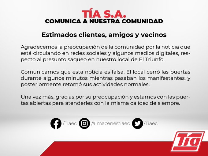 Almacenes Tía emitió un comunicado este lunes 13 de junio del 2022, para desmentir la información que circula en redes sociales sobre un supuesto saqueo en uno de sus locales. El video hace referencia a El Triunfo, en la provincia del Guayas.