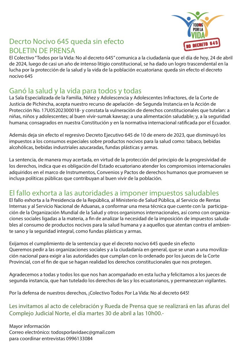 En un comunicado emitido por la organización se señala que el fallo exhorta a la Presidencia de la República, Ministerio de Salud Pública, al Servicio de Rentas Internas (SRI), entre otros, a conformar una mesa técnica para analizar “la necesidad de la imposición de impuestos saludables al consumo de productos nocivos para la salud humana”.