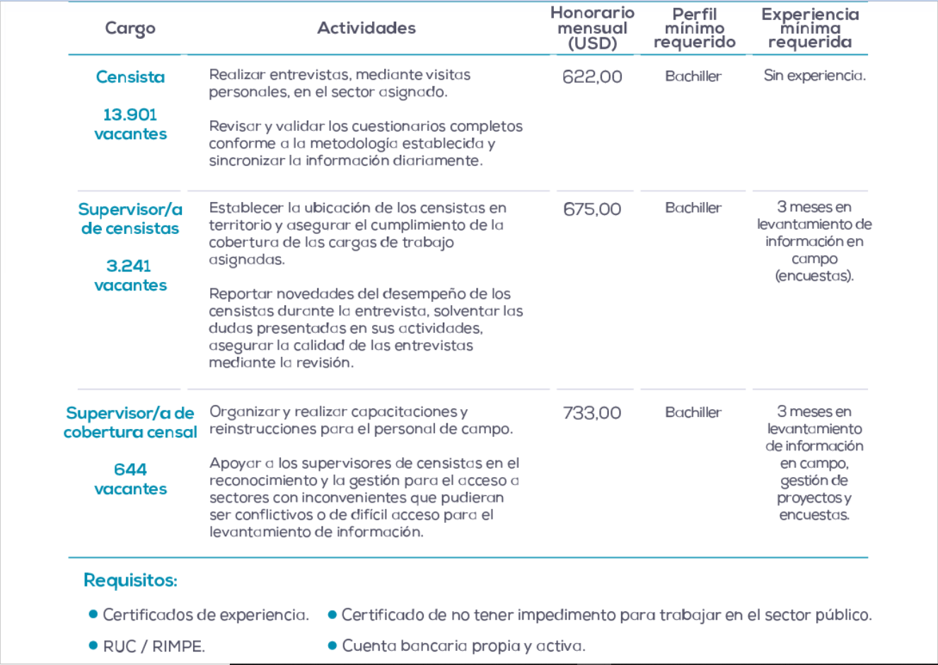 Puedes postularte el 15 y 16 de septiembre de 2022 de 08:00 a 18:00 en el siguiente enlace: https://reclutamiento.inec.gob.ec/