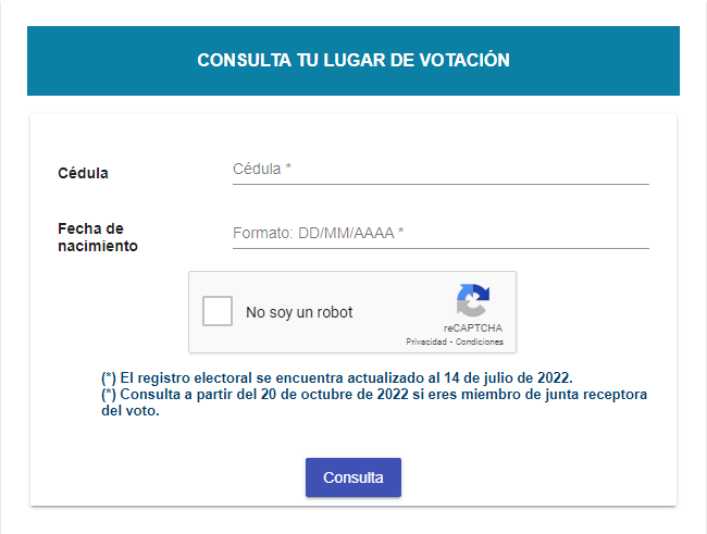 Una vez dentro debe agregar sus datos, número de cédula, fecha de nacimiento y llenar la casilla “No soy un robot” (en ocasiones aquí salen preguntas que deberá responder), se abrirá una ventana en la que constará el lugar en el que debe sufragar y si es miembro de mesa.