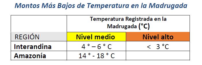 En el callejón Interandino, los mayores descensos de temperatura se presentarán en localidades por encima de los 3.200 m.s.n.m.. Mientras que, en la región Amazónica, menores temperaturas en la madrugada en las zonas de estribación de cordillera.