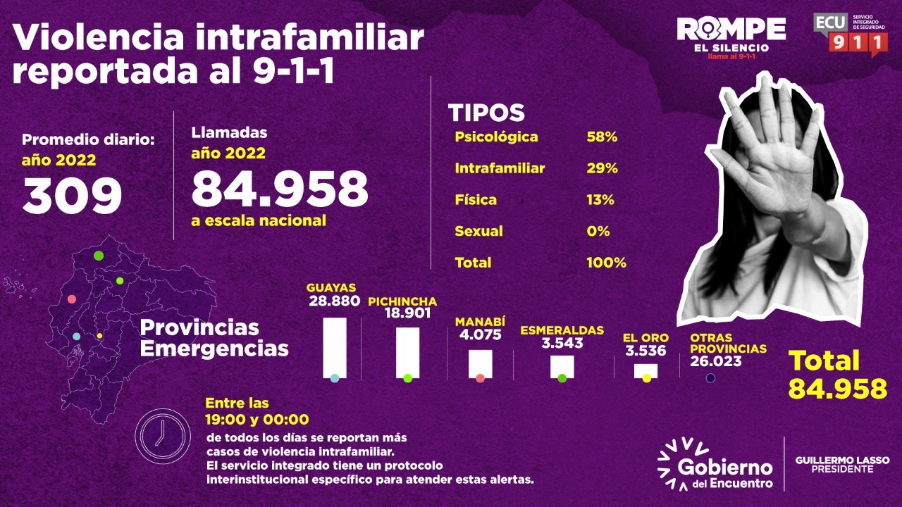 Según el comunicado emitido por el ECU 911, “Esta iniciativa —que se difundirá en todos los canales de comunicación del ECU 911— incluye mensajes como: “Si tu pareja o un familiar te golpea, te insulta, te amenaza… ¡Actúa! Eso es violencia”, “Si en la calle o en tu barrio, ves un caso de violencia, ayuda a la víctima; aunque no la conozcas”. “¡Rompe el silencio!, llama al 9-1-1”, dirigidos a visibilizar este tipo de agresiones, apoyar para prevenirlas y aunar esfuerzos en la lucha para evitar el incremento de estas preocupantes estadísticas.