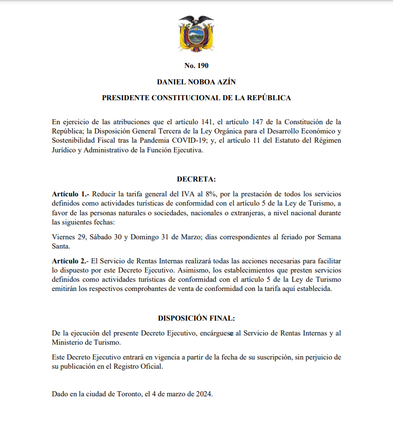 El Impuesto al Valor Agregado IVA bajará al 8%. El presidente Daniel Noboa emitió el Decreto Ejecutivo 190 en el que se establece que la reducción regirá para “la prestación de todos los servicios definidos como actividades turísticas”. La medida regirá por el feriado de Semana Santa; es decir, durante el viernes 29, sábado 30 y domingo 31 de Marzo de 2024.