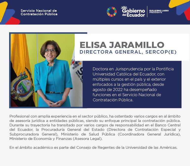 La doctora en Jurisprudencia, Elisa Jaramillo, es la nueva encargada de la Dirección General del Servicio Nacional de Contratación Pública (Sercop).La institución es la responsable de desarrollar y administrar el Sistema Oficial de Contratación Pública del Ecuador (SOCE) y de establecer las políticas y condiciones de la contratación pública a nivel nacional.