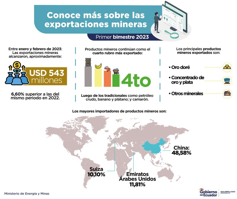 Entre enero y febrero del 2023, Ecuador exportó USD 542,74 millones en productos mineros, 6,60% más de lo exportado en el mismo periodo en 2022, de acuerdo con la información publicada por el Banco Central del Ecuador (BCE).