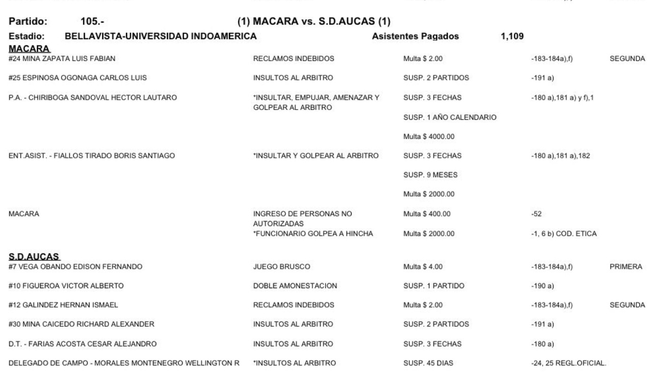 Héctor Lautaro Chiriboga, asistente en el Macará, fue suspendido durante un año calendario, luego que agrediera con un golpe de puño al árbitro Álex Cajas. Así lo determinó este miércoles 24 de agosto del 2022 la Cámara de Resolución y Disputas de la Cámara de Comercio de Guayaquil, encargada de establecer las sanciones disciplinarias de la LigaPro.